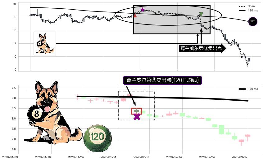 形态多维评估: ⚀ 2020-02-05-日显现 葛兰威尔均线 120日均线 第⑧卖出点 下降趋势的中继信号,后市看跌,卖出信号