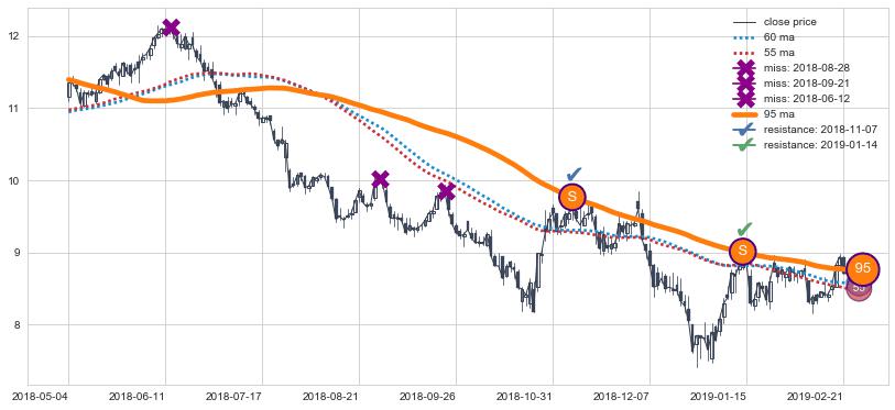 下跌趋势2018-05-04-2019-02-22,均线95确认关键阻力2处