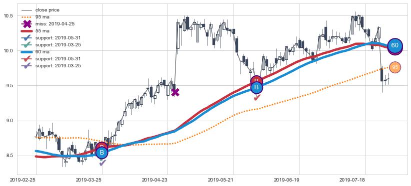上涨趋势2019-02-25-2019-07-29,均线60, 55确认关键支撑2处