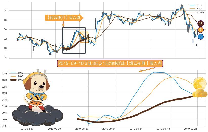 ⚀ 2019-08-23日-2019-09-25日显现 3日-8日-21日均线 【烘云托月】买入点 看多信号,后市看涨,买入