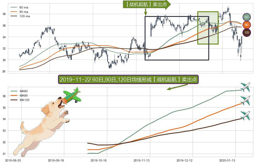 ⚀ 2019-10-03日-2020-01-16日显现 60日-90日-120日均线 【战机起航】卖出点 看空信号,后市看跌,卖出