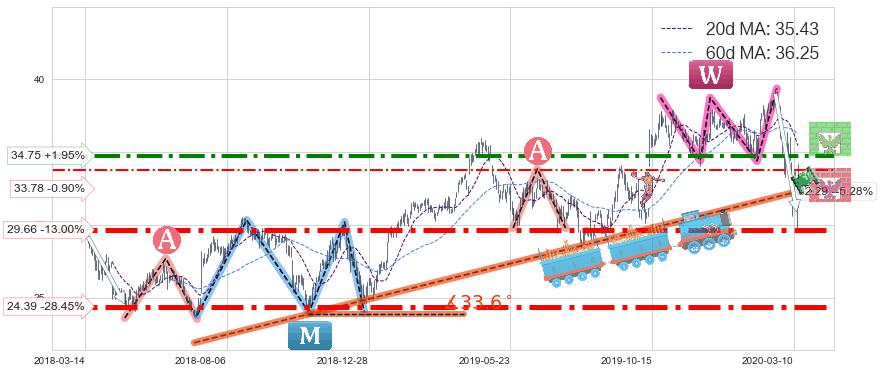 ♘ 阻力价格位34.75,可信任强度74.85%,距离最后交易2020-03-13形成的收盘价格34.09相差 +1.95%