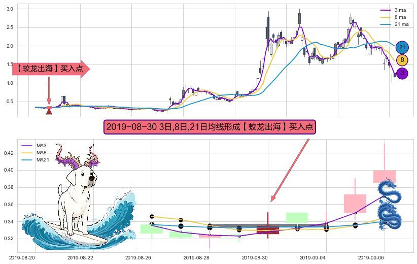 ⚀ 2019-08-30日显现 3日-8日-21日均线 【蛟龙出海】买入点 看多信号,后市看涨,买入