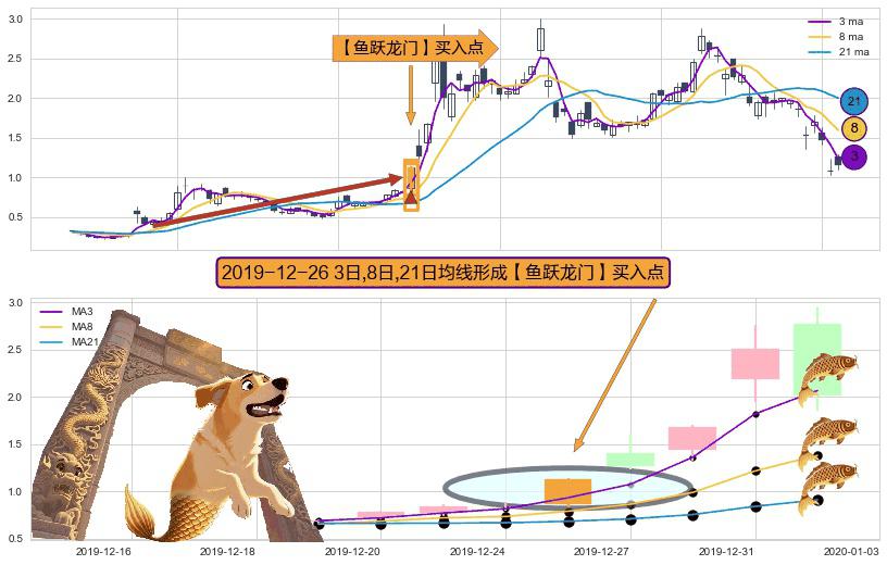 ⚀ 2019-12-26日显现 3日-8日-21日均线 【鱼跃龙门】买入点 看多信号,后市看涨,买入