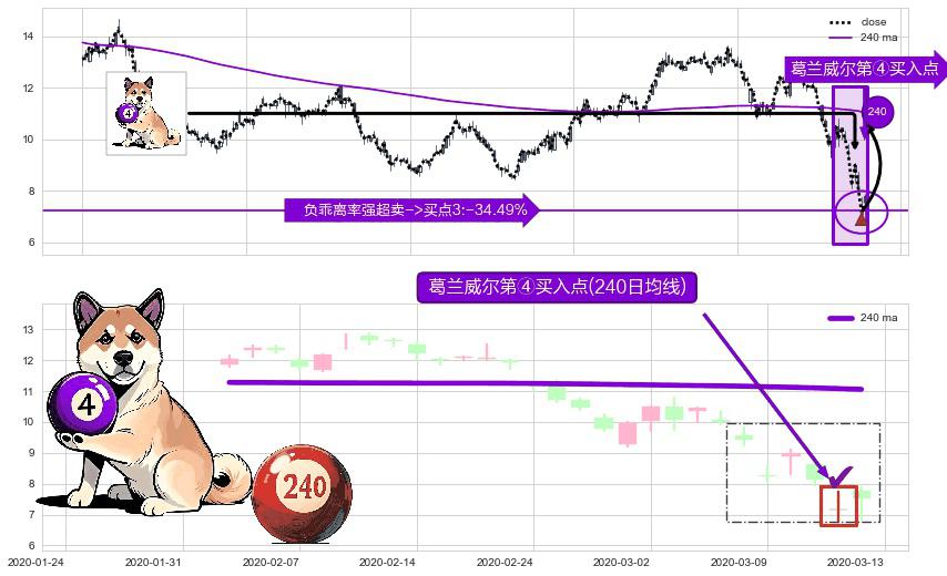 形态多维评估: ⚀ 2020-03-12-日显现 葛兰威尔均线 240日均线 第④买入点 下降趋势均值回复的短线反弹信号,后市看涨,买进信号