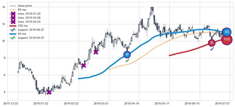 上涨趋势2015-12-22-2016-07-07,均线105, 45确认关键支撑2处