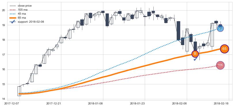 上涨趋势2017-12-07-2018-02-16,均线65确认关键支撑1处