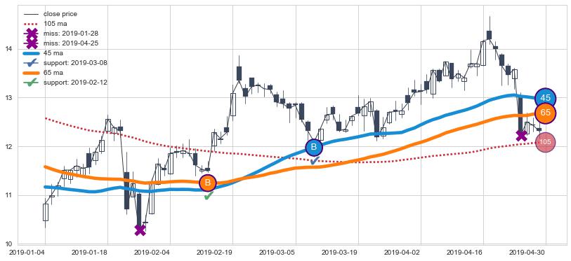 上涨趋势2019-01-04-2019-04-30,均线65, 45确认关键支撑2处