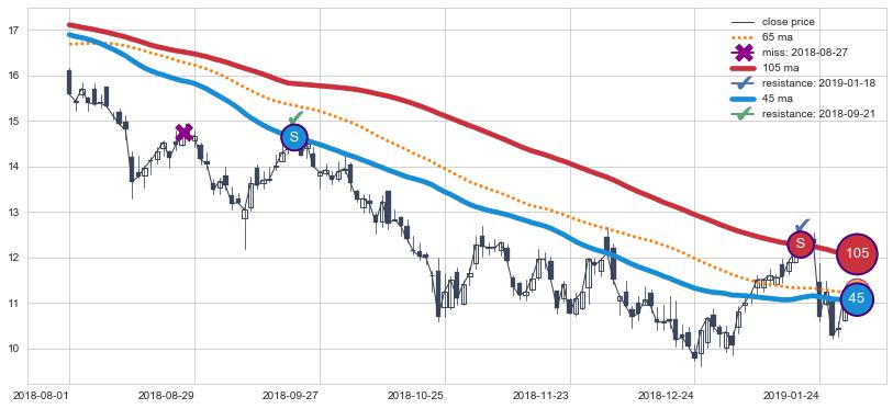 下跌趋势2018-08-01-2019-01-30,均线105, 45确认关键阻力2处