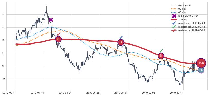 下跌趋势2019-03-11-2019-10-30,均线105确认关键阻力3处