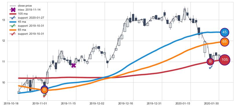 上涨趋势2019-10-18-2020-01-31,均线65, 105, 45确认关键支撑2处