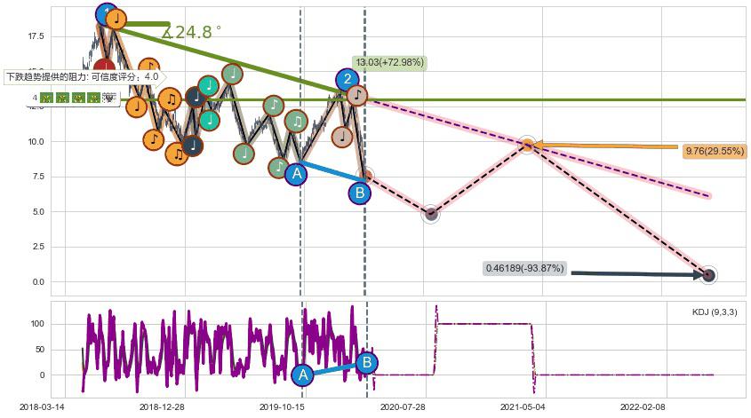 从2018-06-06至2020-03-13,共包含446个交易日,阶段股价下跌-69.19%,阶段股价变动位移路程比: 1 : 13,下跌趋势角度: 24.8