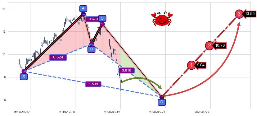 ➣ 未完成【螃蟹】形态起点X: 2019-10-08, 已到达C点: 2020-02-12, 预测最终D点: 2020-05-15, 共153交易日