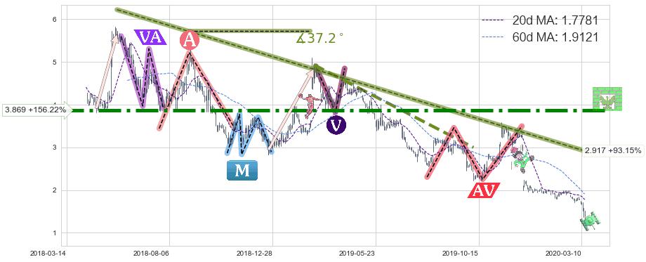从2018-05-23至2020-03-13,共包含455个交易日,阶段股价下跌-96.28%,阶段股价变动位移路程比: 1 : 11,下跌趋势角度: 37.2,2019-12-16向↘︎形成缺口,跳空下跌-38.02%˚