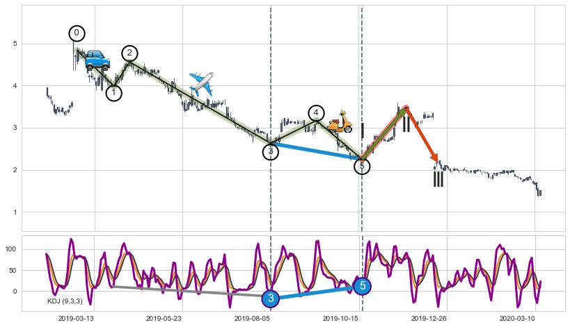 ➣ 第三,五驱动浪端点:【KDJ】走势出现【常规背离 & 反转信号】背离程度65.69%,背离夹角角度46.1˚,背离程度较大