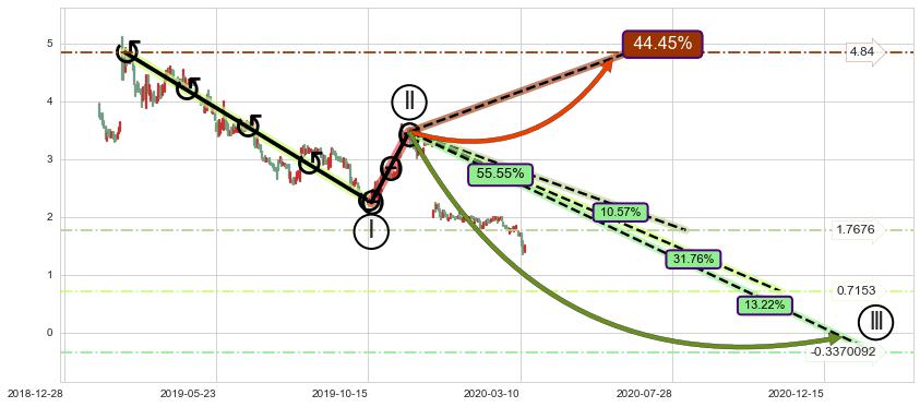 ➣ 调整浪已超过预测的c点位置,后续大趋势循环浪继续下跌概率55.55%,谨慎做多