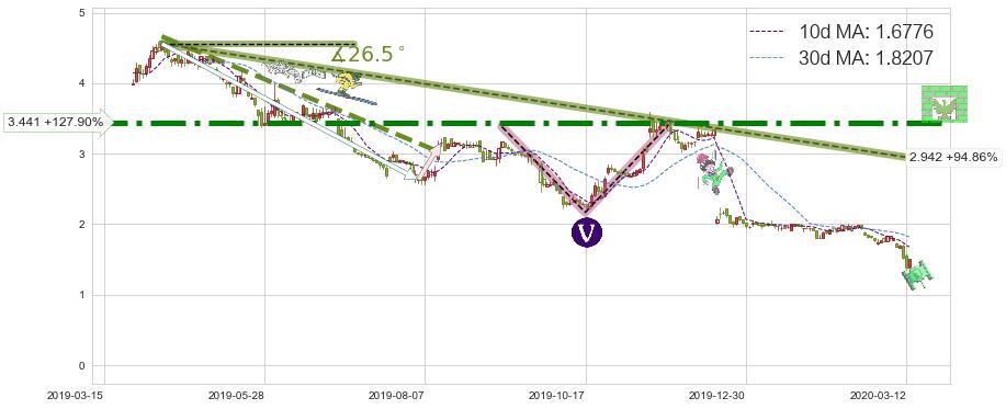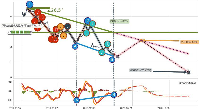 从2019-04-10至2020-03-13,共包含234个交易日,阶段股价下跌-90.44%,阶段股价变动位移路程比: 1 : 5,下跌趋势角度: 26.5,2019-12-16向↘︎形成缺口,跳空下跌-38.02%˚