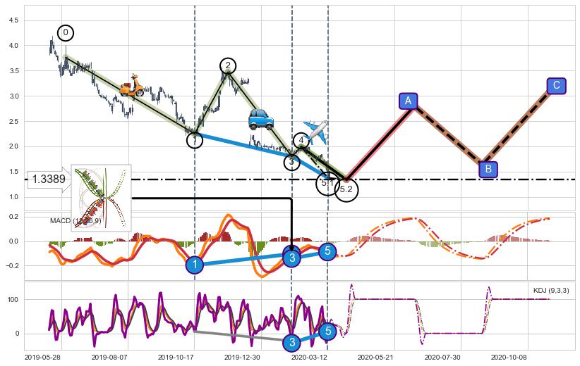 ➣ 5.1: 预测当前第5浪位置(2020-03-12, 1.3800),仍然有下跌空间