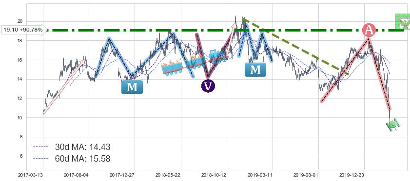 ♘ 阻力价格位19.10,可信任强度89.58%,距离最后交易2020-03-13形成的收盘价格10.01相差 +90.78%