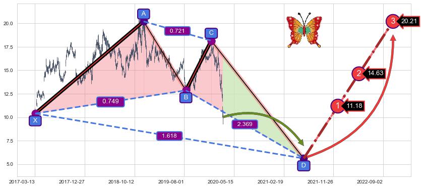 ➣ 未完成【蝴蝶】形态起点X: 2017-03-14, 已到达C点: 2020-01-07, 预测最终D点: 2021-06-14, 共1081交易日