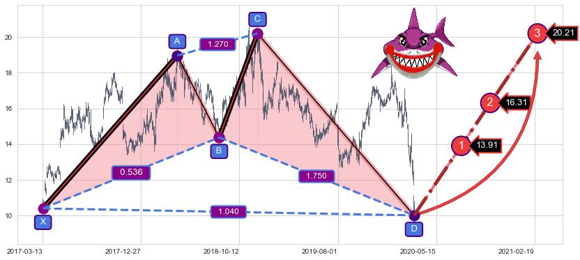 ➣ 已完成【鲨鱼】形态起点X: 2017-03-14, 终点D: 2020-03-13, 共755交易日