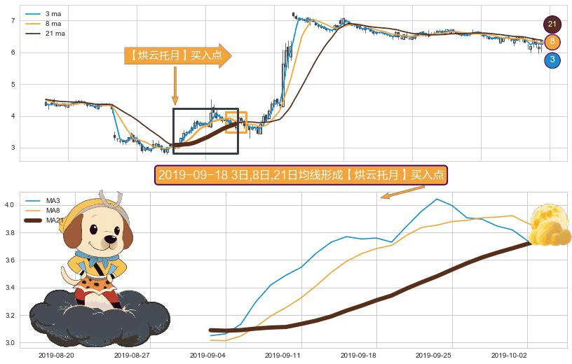 形态多维评估: ⚀ 2019-09-03日-2019-10-03日显现 3日-8日-21日均线 【烘云托月】买入点 看多信号,后市看涨,买入