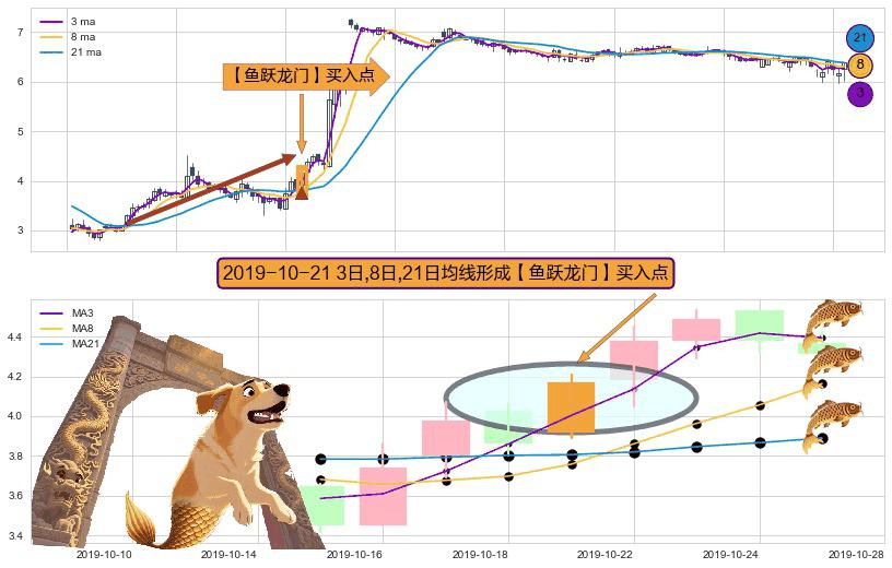 形态多维评估: ⚀ 2019-10-21日显现 3日-8日-21日均线 【鱼跃龙门】买入点 看多信号,后市看涨,买入