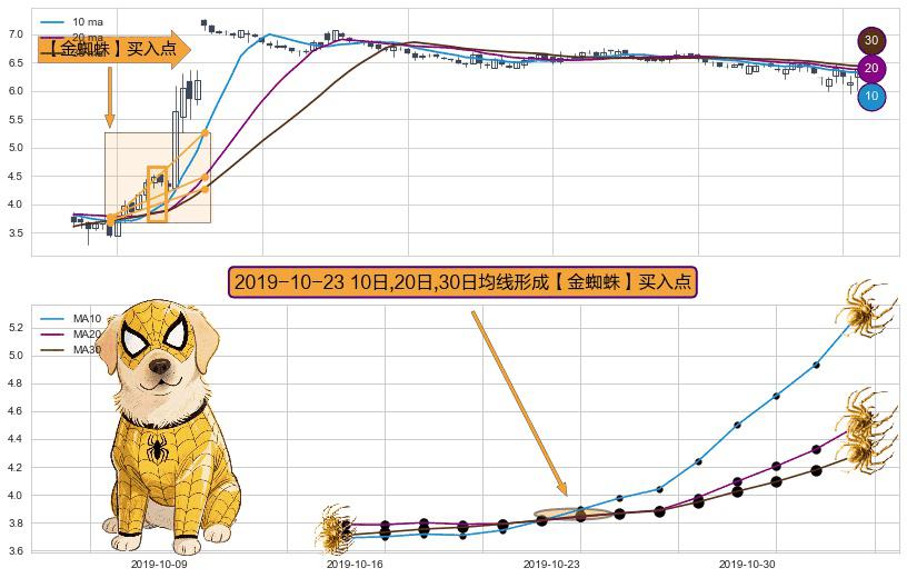 形态多维评估: ⚀ 2019-10-23日显现 10日-20日-30日均线 【金蜘蛛】买入点 看多信号,后市看涨,买入