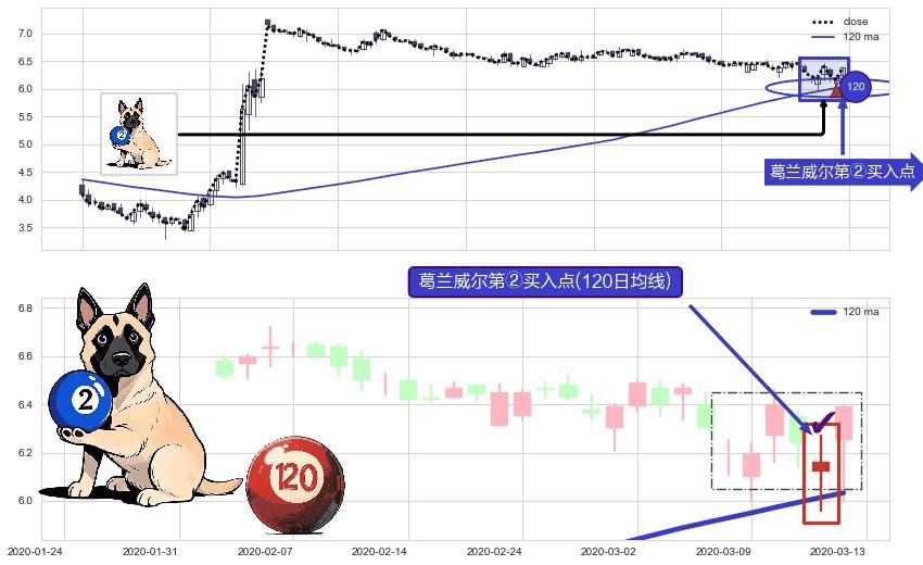 形态多维评估: ⚀ 2020-03-12-日显现 葛兰威尔均线 120日均线 第②买入点 上升趋势的中继信号,后市看涨,买进信号