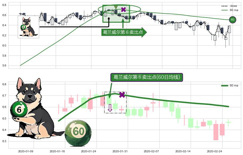 形态多维评估: ⚀ 2020-01-28-日显现 葛兰威尔均线 60日均线 第⑥卖出点 走势反转见顶信号,后市看跌,卖出信号
