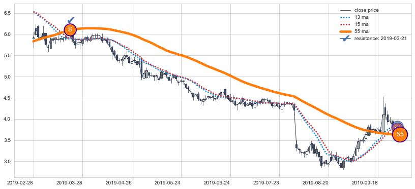 下跌趋势2018-09-17-2018-10-31,均线13, 15确认关键阻力2处