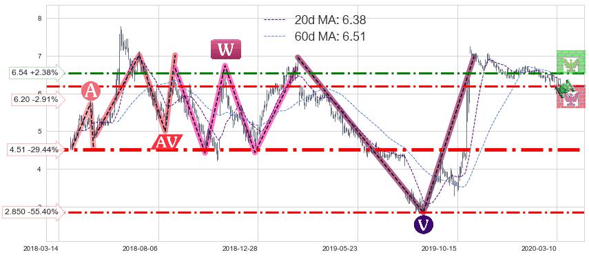 ♘ 支撑价格位6.20,可信任强度64.77%,距离最后交易2020-03-13形成的收盘价格6.39相差 -2.91%