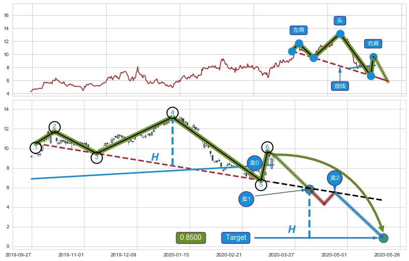 ➣ 最小反转跌幅→𝐇: 4.97 (头部与颈线垂直距离)