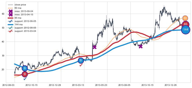 上涨趋势2012-08-03-2014-01-13,均线144, 85确认关键支撑2处