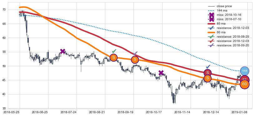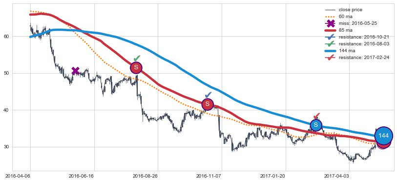 下跌趋势2016-04-06-2017-05-04,均线144, 85确认关键阻力3处