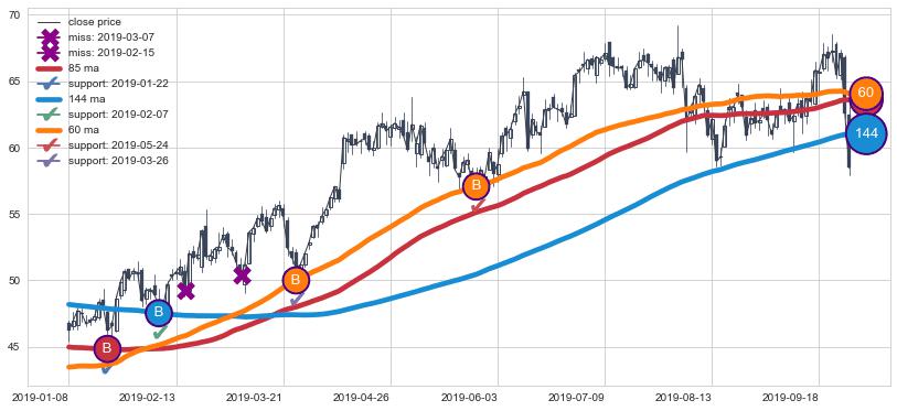 上涨趋势2019-01-08-2019-09-27,均线144, 60, 85确认关键支撑4处