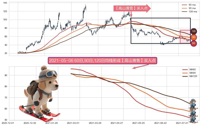 ⚀ 2021-02-17日-2021-07-23日显现 60日-90日-120日均线 【高山滑雪】买入点 看多信号,后市看涨,买入