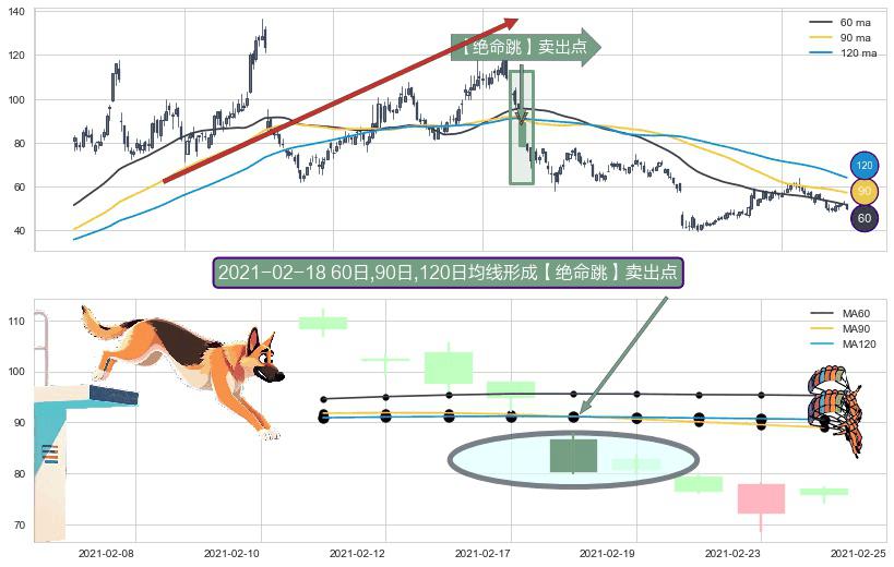 ⚀ 2021-02-18日显现 60日-90日-120日均线 【绝命跳】卖出点 看空信号,后市看跌,卖出