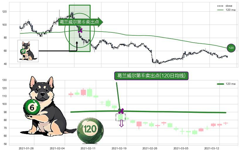 ⚀ 2021-02-18-日显现 葛兰威尔均线 120日均线 第⑥卖出点 走势反转见顶信号,后市看跌,卖出信号