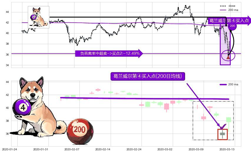 形态多维评估: ⚀ 2020-03-12-日显现 葛兰威尔均线 200日均线 第④买入点 下降趋势均值回复的短线反弹信号,后市看涨,买进信号