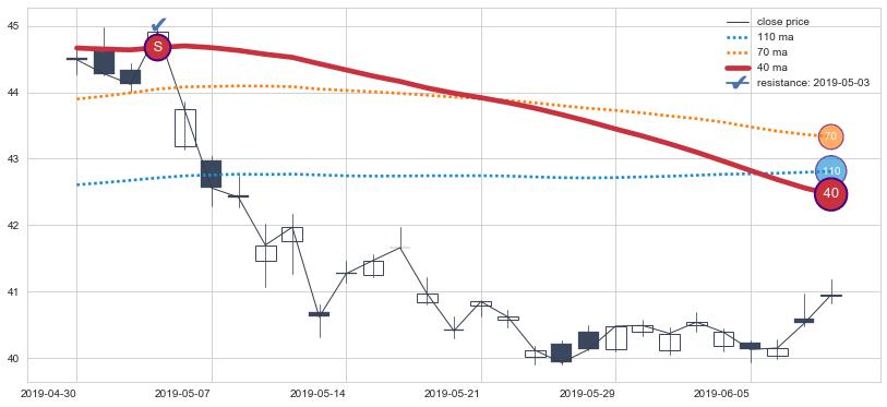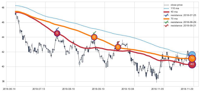 下跌趋势2018-06-14-2018-11-29,均线40, 70确认关键阻力3处