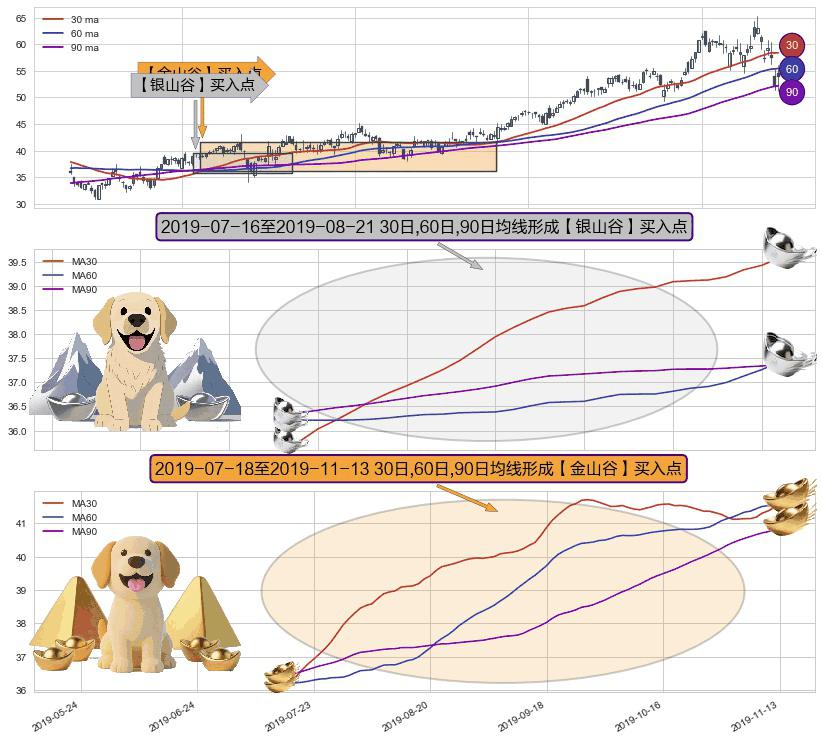 ⚀ 2019-07-19-日至2019-11-13-日显现 30日-60日-90日均线 【金山谷】买入点 其再次确认了买入信号,可靠性更强,买入
