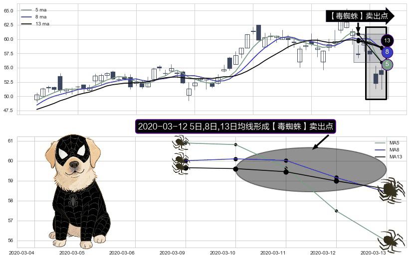 ⚀ 2020-03-12日显现 5日-8日-13日均线 【毒蜘蛛】卖出点 看空信号,后市看跌,卖出