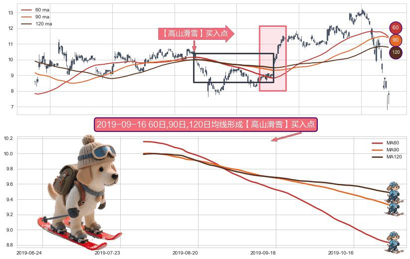 ⚀ 2019-07-31日-2019-10-29日显现 60日-90日-120日均线 【高山滑雪】买入点 看多信号,后市看涨,买入