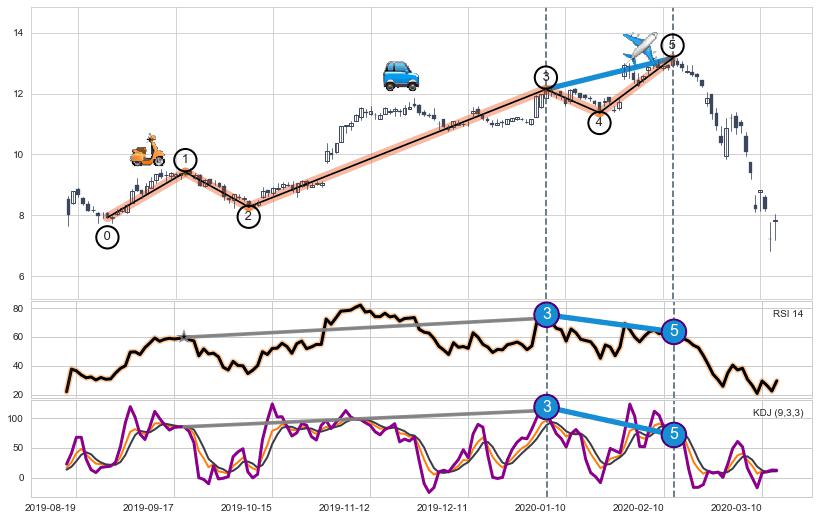➢ 第三,五驱动浪端点:【KDJ】走势出现【常规背离 & 反转信号】背离程度99.00%,背离夹角角度41.4˚,背离程度较大