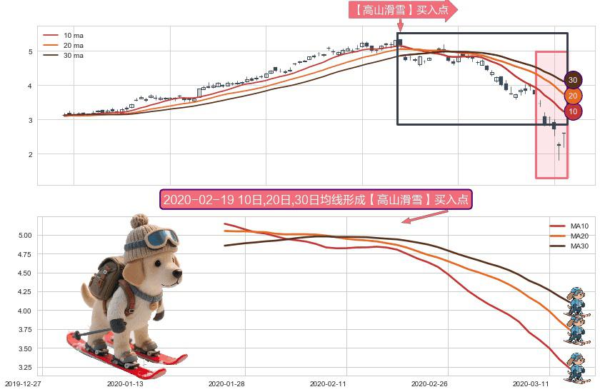 ⚀ 2020-01-24日-2020-03-13日显现 10日-20日-30日均线 【高山滑雪】买入点 看多信号,后市看涨,买入