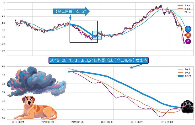 ⚀ 2019-07-16日-2019-09-10日显现 3日-8日-21日均线 【乌云密布】卖出点 看空信号,后市看跌,卖出