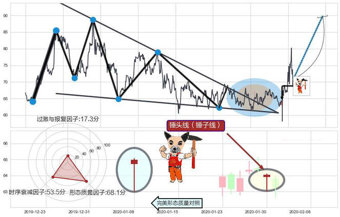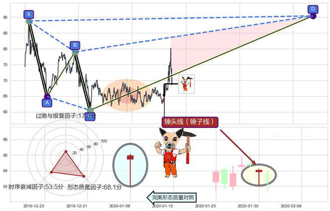 ➢ 🕰 价格走势在2020-01-30至2020-01-30期间形成锤头线(锤子线),残存影响值:3.28