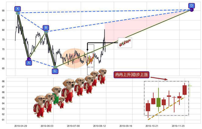 ➢ 冉冉上升|稳步上涨 + 谐波鲨鱼下沉击穿c上涨拐点信号叠加后【反向回撤率】低,【看多】信号叠加【存续影响大】