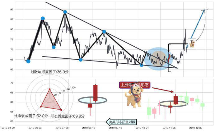 ➣ 上涨螺旋桨形态 + 降楔型阻力突破转换支撑上涨信号叠加后【目标达成率】低,【看多】信号叠加【存续影响大】
